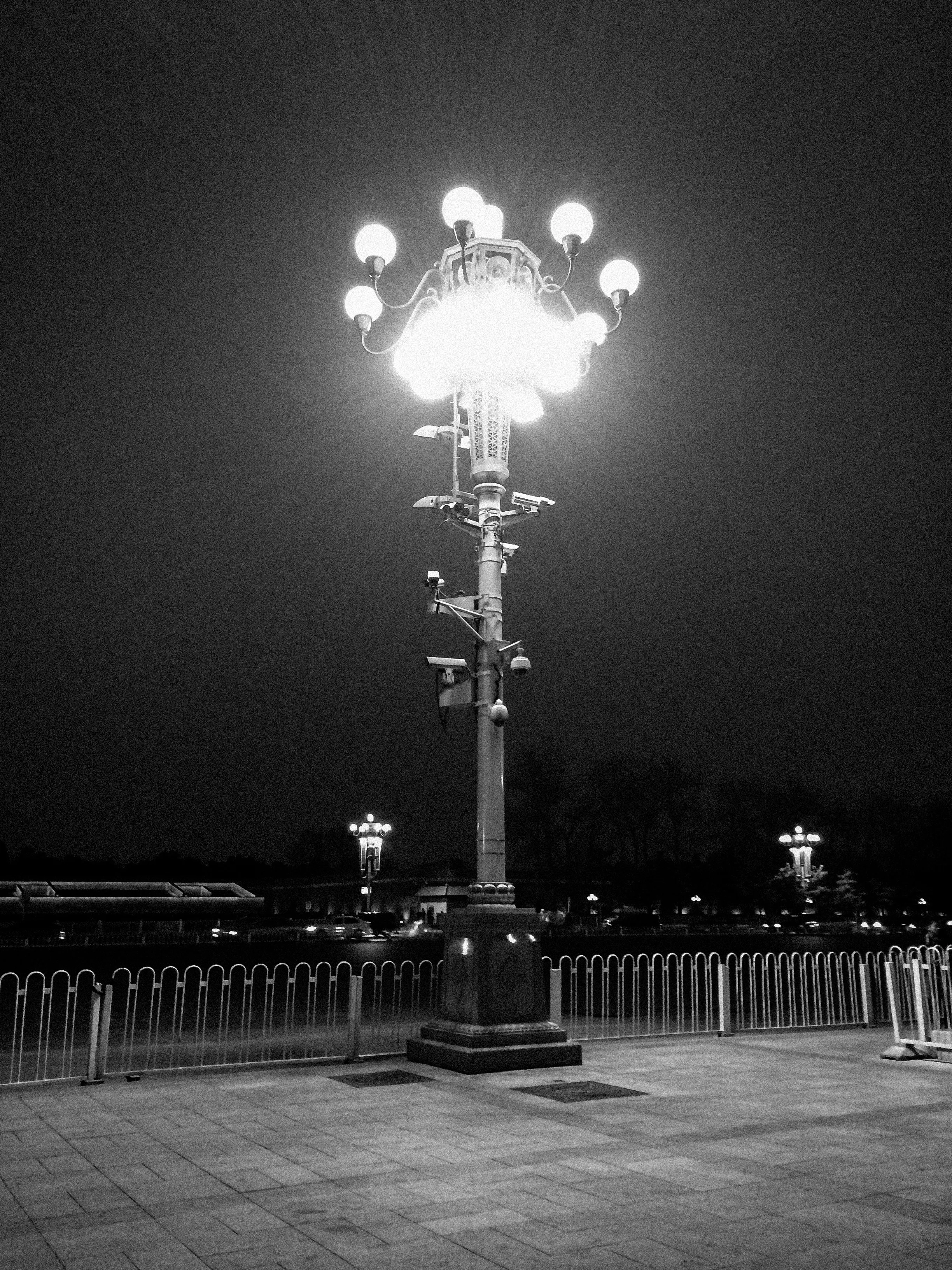 An ornate street lamp burns brightly at the edge of Tiananmen Square, banishing shadows and providing ample light for the watchful eyes of the State. The elegance of the lamp, and the beauty of the public square is disrupted by the indiscreet industrial design of eight separate security cameras clinging to its stem.